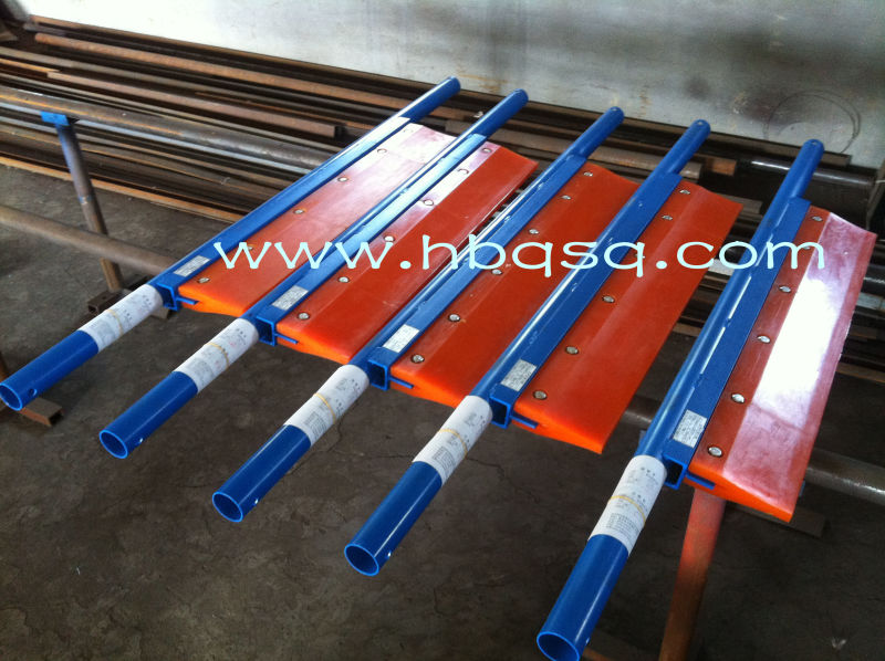 二道清掃器安裝在頭輪下部回移皮帶平直工作面處。P型清掃高分子聚氨酯器適用于清掃回移帶工作面上粘附的物料,屬于二道清掃器。
