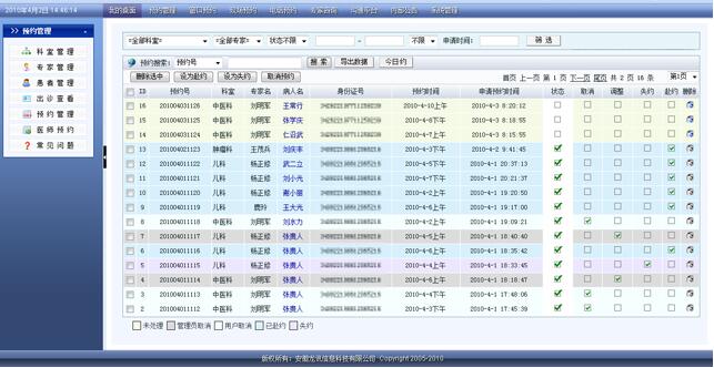 3、 預(yù)約確認(rèn)后,生成預(yù)約號(hào),就診時(shí),需憑預(yù)約號(hào)領(lǐng)取門(mén)診號(hào)就診。 后臺(tái)管理功能描述 1、 修改、取消患者預(yù)約信息。 2、 領(lǐng)取門(mén)診號(hào)后,需銷(xiāo)號(hào)。(建議在門(mén)診系統(tǒng)的操作界面中套嵌銷(xiāo)號(hào)界面,且留有數(shù)據(jù)接口) 3、 統(tǒng)計(jì)、查詢(xún)功能:可根據(jù)管理的需要,隨意進(jìn)行各類(lèi)定制的統(tǒng)計(jì)和查詢(xún)。